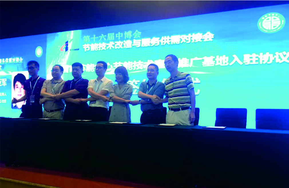 公司董事長(zhǎng)陳程(左二)在第十六屆中博會(huì)節(jié)能技術(shù)改造與服務(wù)供需對(duì)接會(huì)上簽約留影